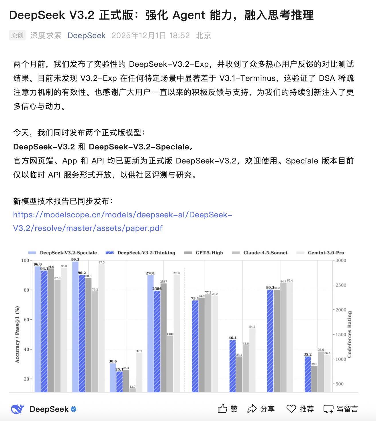 凤凰网科技讯 12月1日配资炒股配资门户,深度求索(DeepSeek)正式发布新一代开源大模型DeepSeek-V3.2及其长思考增强版DeepSeek-V3.2-Speciale。官方网页端、App及API已同步更新至V3.2版本。