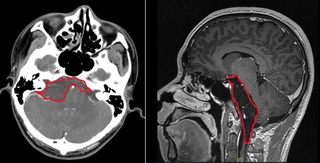 患者李先生(化名),二十多岁,因头晕、听力下降、走路不稳三个月,来到我院神经外科门诊找到郝少才主任就诊。颅脑核磁共振检查结果提示:桥小脑角区竟潜伏着一颗大小超6厘米的巨大肿瘤!这颗肿瘤范围上至鞍上压迫视神经,下至枕骨大孔区,脑干压迫明显且腹侧也有肿瘤生长。肿瘤包绕动眼神经、外展神经、三叉神经、面听神经以及后组多根颅神经,此外也包绕椎基底动脉及其主要分支。