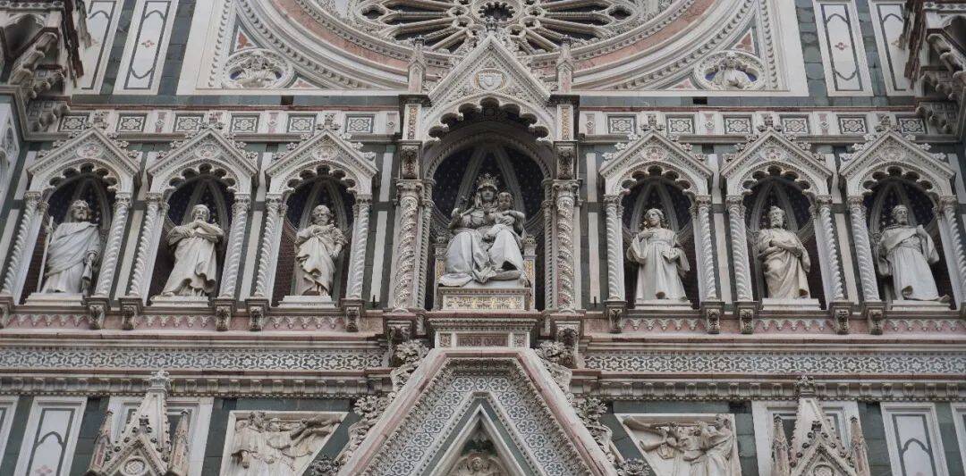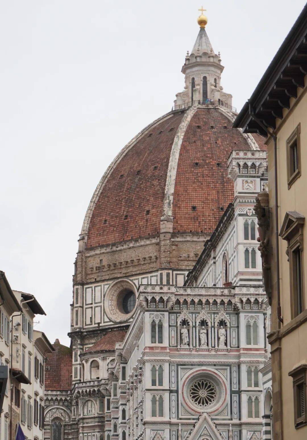 圣母百花大教堂:哥特式到文艺复兴风格的过渡,阿诺尔福·迪·坎比奥和詹·皮耶罗·皮桑设计的外立面装饰精细,尖顶和高耸的拱顶具有典型的哥特式特点,布鲁内莱斯基的圆顶则是文艺复兴建筑风格的一个重要象征。