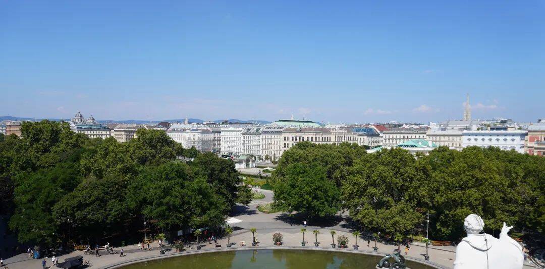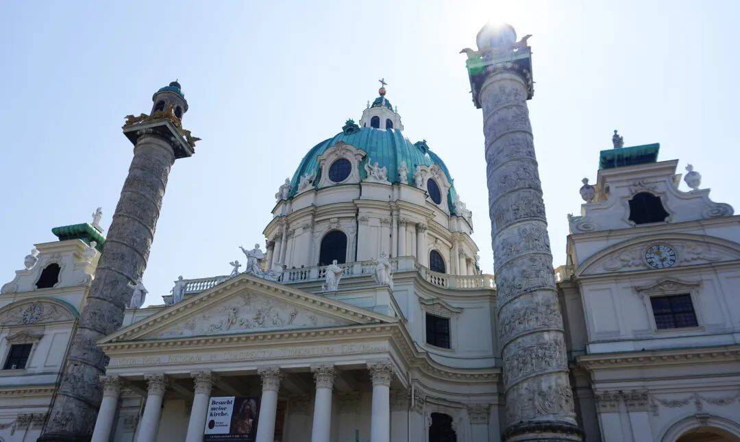 维也纳卡尔教堂:巴洛克风格教堂,正面呈现古希腊神庙风格,有山墙、门廊及科林斯式立面,两根高高的罗马式浮雕柱仿自罗马的图拉真凯旋柱。两个边厢采用意大利文艺复兴风格,搭配巴洛克式绿色穹顶与塔楼 ,外形富有动感,在阳光照耀下格外醒目。