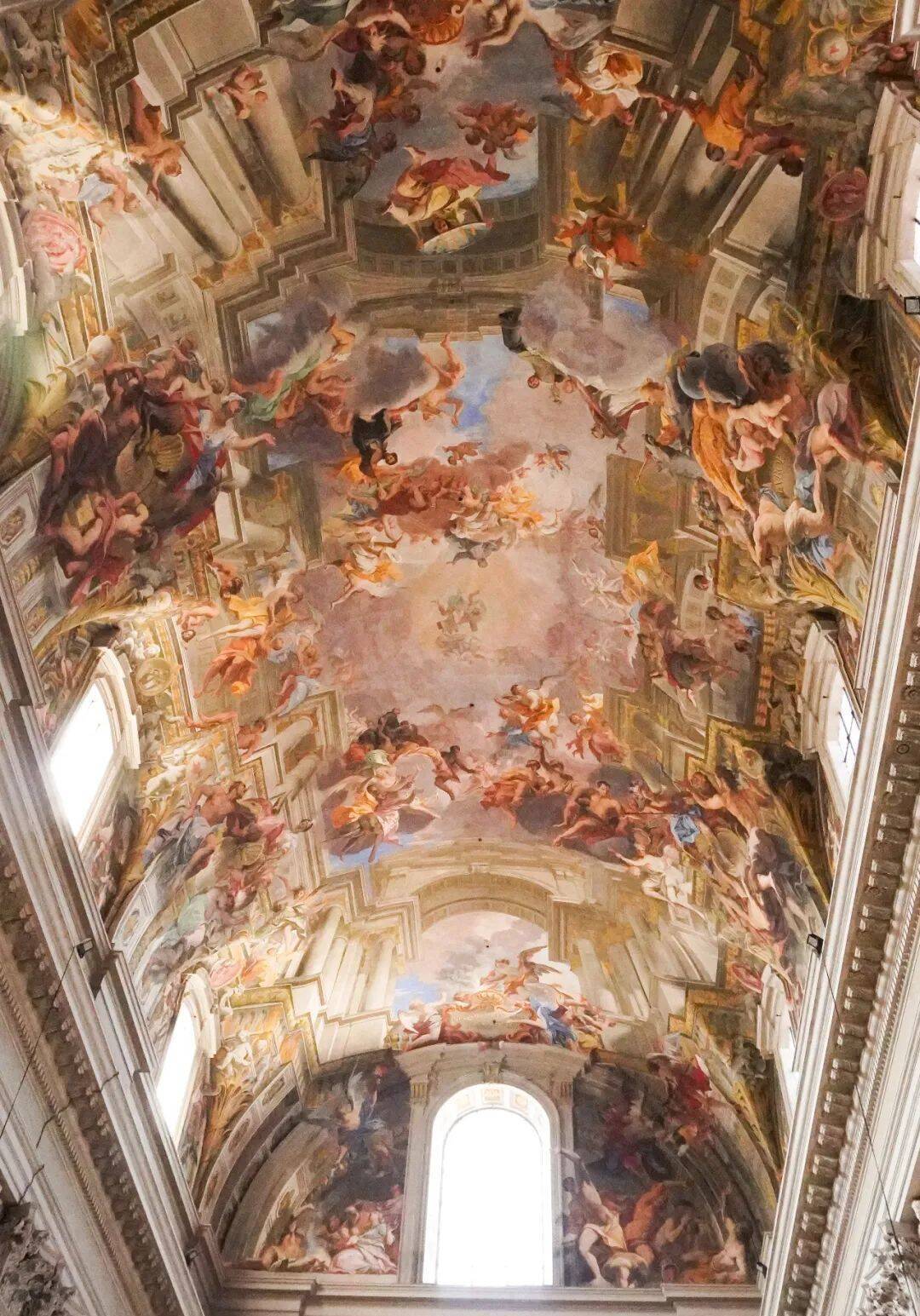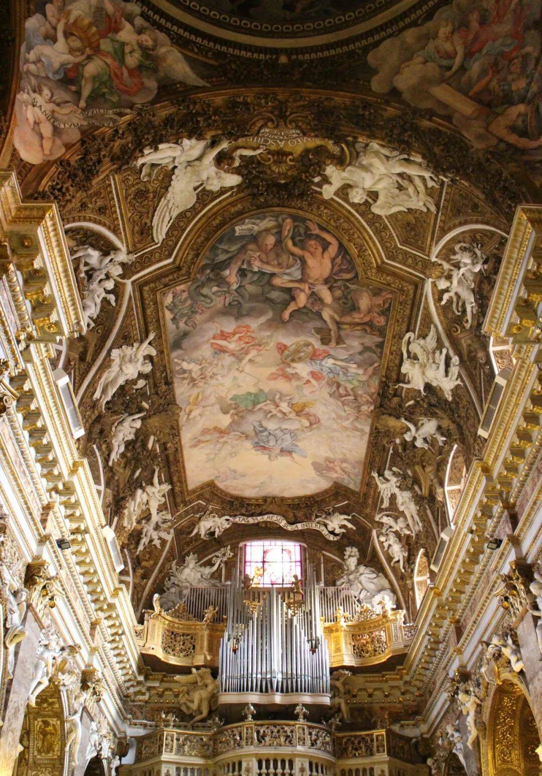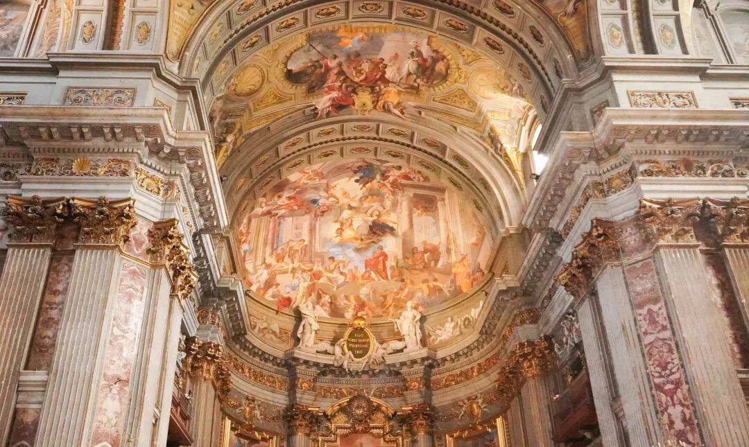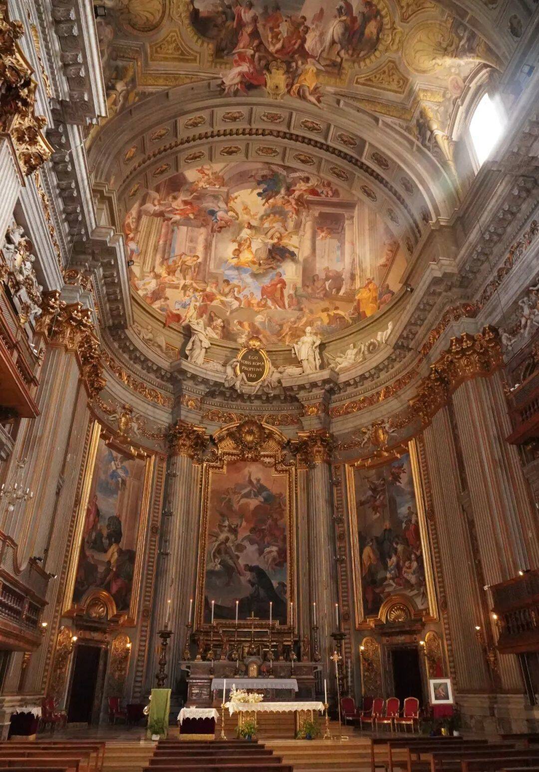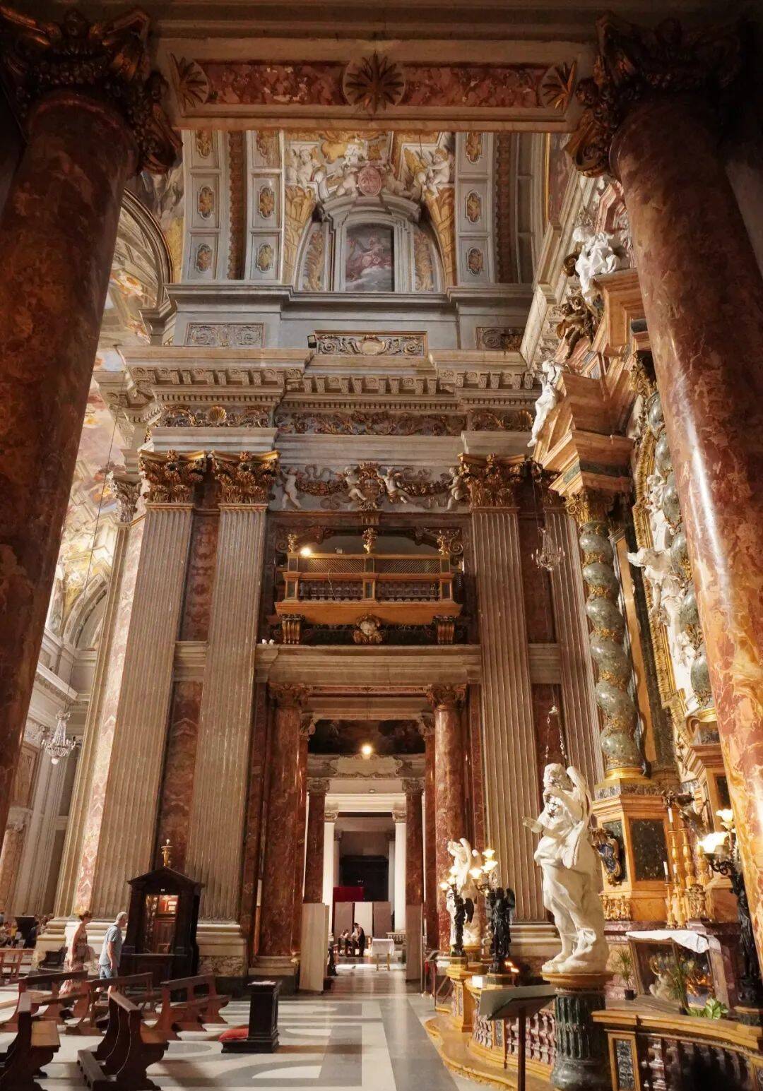 圣依纳爵堂的天顶壁画《圣依纳爵的神化》,色彩浓烈而和谐,金黄与湛蓝交织,仿若天堂的光辉倾洒而下。壁画中的人物众多,圣徒、天使形象栩栩如生,他们姿态各异、神情灵动,或庄重祈祷,或轻盈飞翔,动作流畅自然,展现出超凡的神韵。这些壁画巧妙地运用透视法,将二维平面幻化为具有强烈纵深感的三维空间,使得整个教堂内部仿佛与天际相连,步入其中,如同置身于神圣的天界,令人心生敬畏与虔诚,深刻感受到宗教艺术的磅礴力量与迷人魅力。