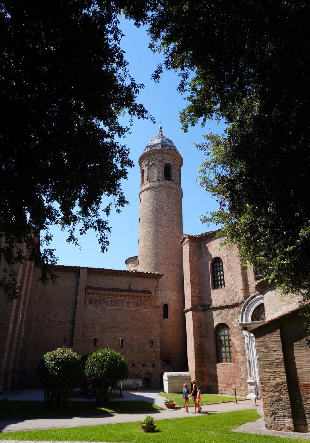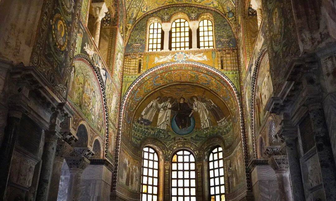 拉文纳的圣维塔莱教堂,内部壁画色彩富丽堂皇,具有鲜明的拜占庭风格,题材有《查士丁尼皇帝有及其随臣》《迪奥多拉皇后及其随从》等。这些壁画细致地描绘了圣经故事场景和圣徒形象,人物形象庄重,线条流畅且富有韵律感,大量金箔的使用,使其在昏暗中闪烁光芒,营造出神圣辉煌的视觉感受,让整个教堂内部宛如天堂般绚烂。