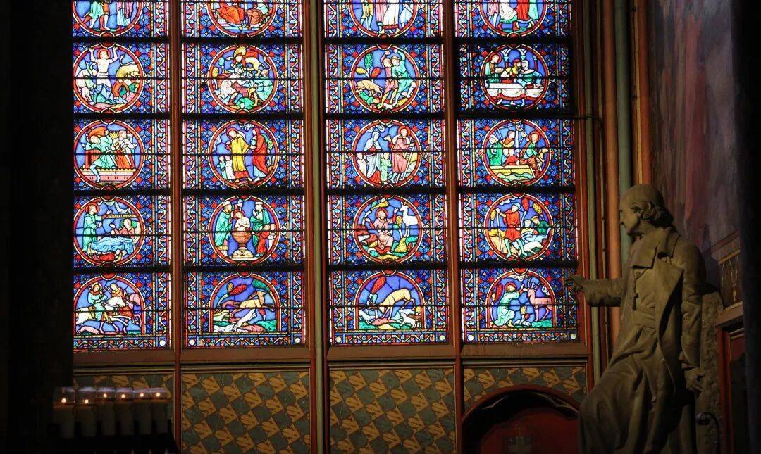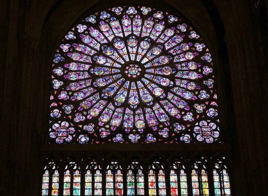 巴黎圣母院中的彩色玻璃窗表现了耶稣基督的生平事迹,包括耶稣降世显奇象、圣母护婴卧马槽、三博士朝圣、最后的晚餐等,还有 “最后的审判” 场景,以及圣母受难、复活以及被圣徒和天使环绕等情节。色调以红、蓝、紫色为主:蓝色象征天国,给人理性、安宁、祥和之感;红色象征基督的鲜血,代表浓烈、正统;紫色象征宗教的神秘,是灵性之色。后期也有更富丽而明亮的色调,如水蓝和明黄等。
