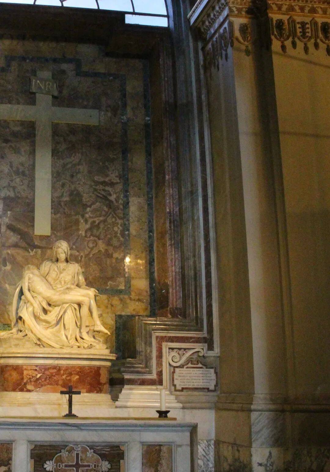 1497 年,米开朗基罗受到法国红衣主教让・德・比耶尔委托,在旧圣彼得大教堂的葬礼小教堂打造一件雕塑。《圣母哀悼》是文艺复兴时期常见的宗教题材,表现了基督教中耶稣被钉死在十字架后,圣母玛利亚哀悼其儿子的场景。圣母玛利亚在耶稣受难过程中所经历的七种痛苦,是天主教 “七苦圣母” 的教义体现。米开朗基罗通过细腻的雕刻手法,将圣母玛利亚静默而复杂的哀伤、耶稣死亡的虚弱和无力等都进行了细致入微的刻画,并非简单的宗教仪式化呈现,而是注入了人文精神。他甚至将自己的名字刻在雕像中圣母胸前的衣带上,这在当时是一种罕见的做法,这表明艺术家开始重视自身的创作价值和个人声誉。(传送门:爱的极致是沉默——《圣殇·米开朗基罗》)